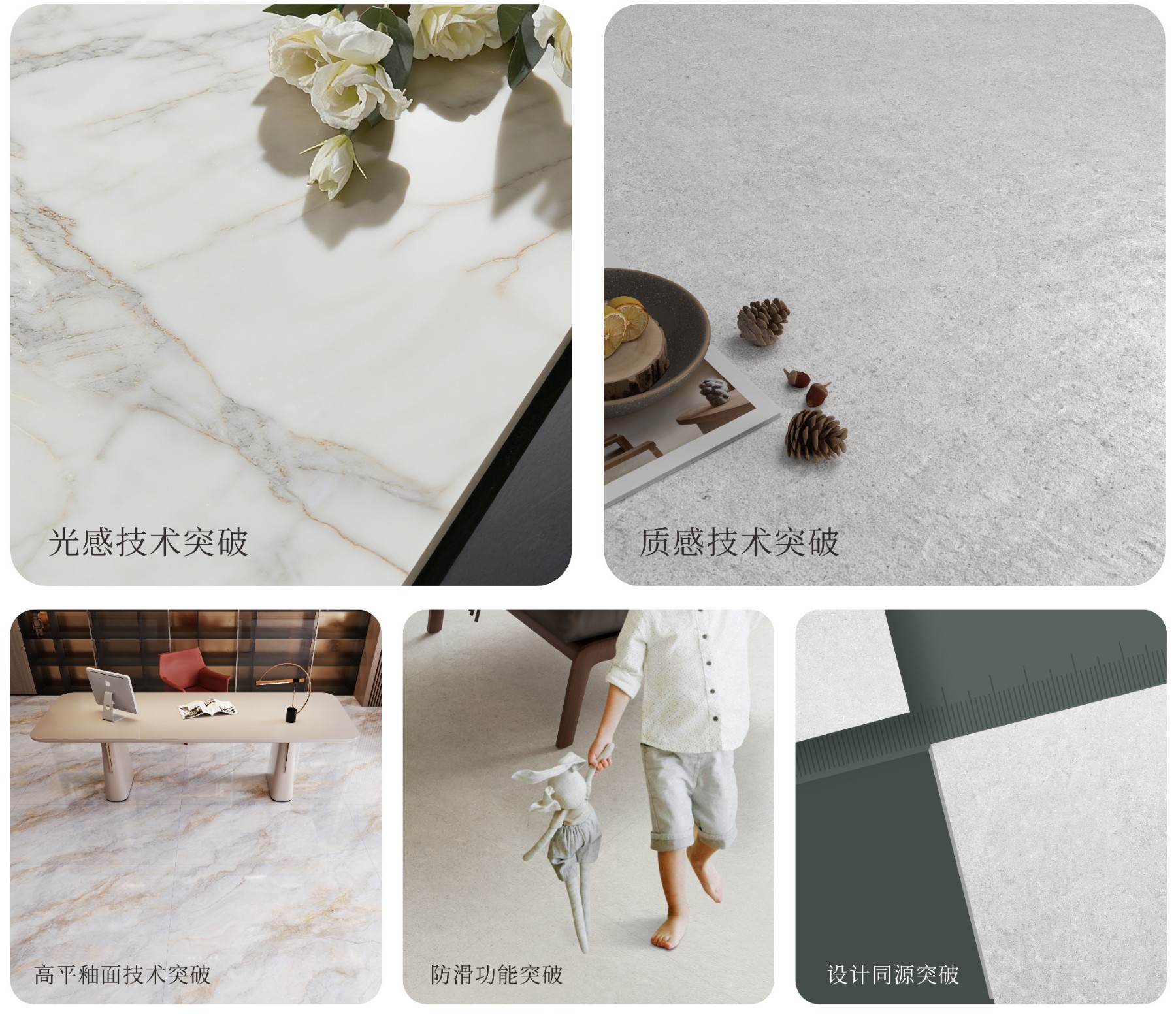 聚焦光感技术、质感技术、高平釉面技术、防滑功能与设计同源五大核心领域,突破工艺极限,打造兼具美感与功能的高附加值产品,抢占技术制高点