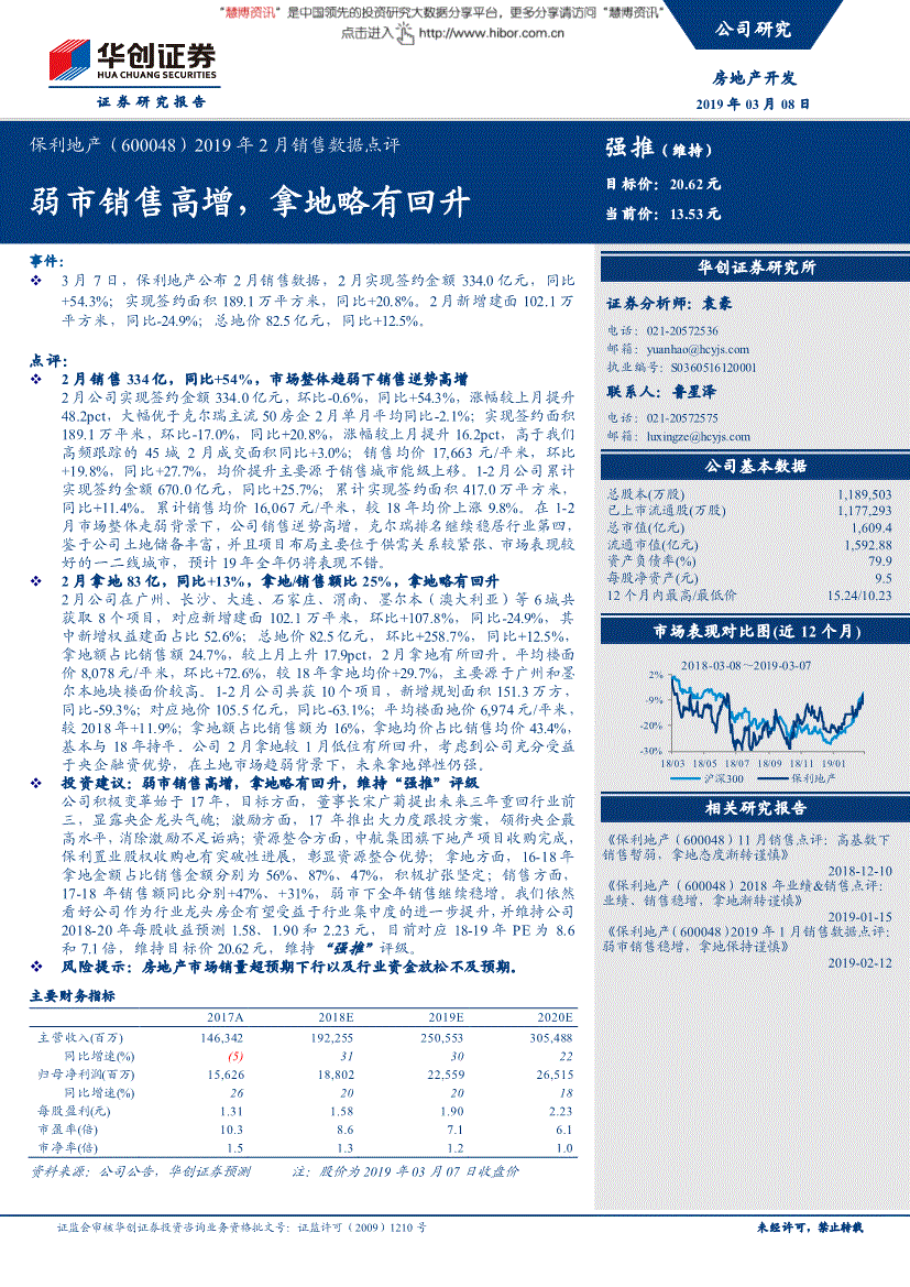 证监会审核华创证券投资咨询业务资格批文号:证监许可(2009)1210号 未经许可,禁止转载证券研究报告保利地产(600048)2019年2月销售数据点评 强推(维持) 弱市销售高增,拿地略有回升目标价:20.62元 当前价:13.53元 事件: 3月7日,保利地产公布2月销售数据,2月实现签约金额334.0亿元,同比+54.3%;实现签约面积189.1万平方米,同比+20.8%。